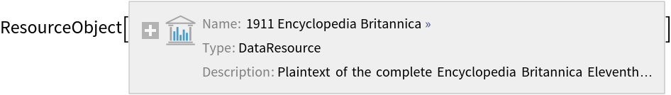 The complete 11th edition of the Encyclopedia Britannica, with individual articles contained in Wolfram Language ContentObjects. May contain minor errors related to text encoding, partitioning of articles, and more. Suitable for experimentation with TextSearch and other functionality.