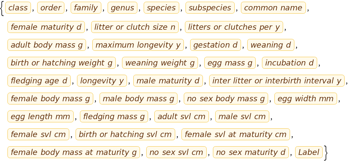 Wolfram Research, "Amniote Life History EntityStore" from the Wolfram Data Repository (2016) https://doi.org/10.24097/wolfram.95462.data