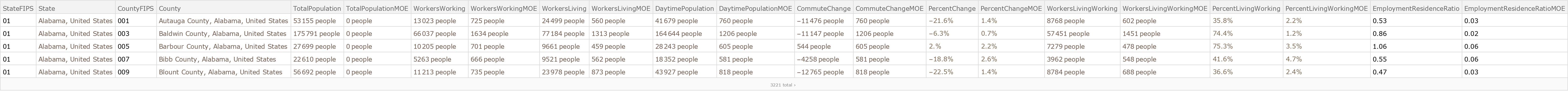 This dataset contains data on commuter-adjusted daytime population, collected by the U.S. Census Bureau from 2006-2010. Patterns of workers from all U.S. counties, Puerto Rico's municipios, and D.C. were analyzed. Rates of daytime population change, as well as employment residence ratio, and information on total number of workers working and/or living in a given county are provided for each county.