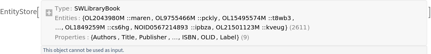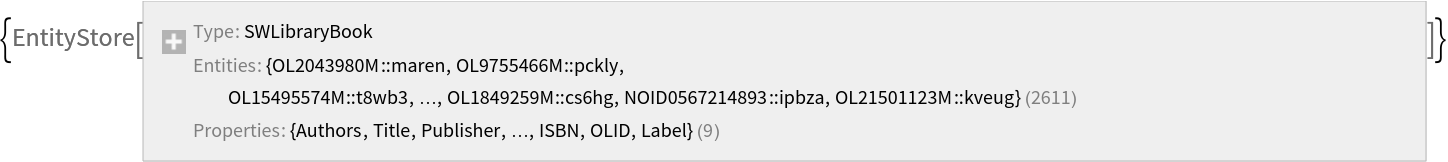 Wolfram Research, "Entity Store of Books in Stephen Wolfram's Library" from the Wolfram Data Repository (2017) https://doi.org/10.24097/wolfram.60032.data