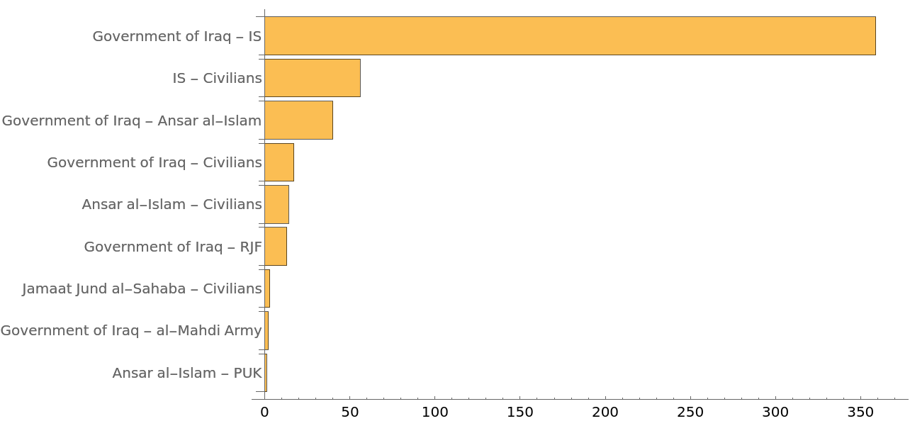 Show counts of violent incidents by dyad (pair of conflicting primary parties) in Iraq in 2005: