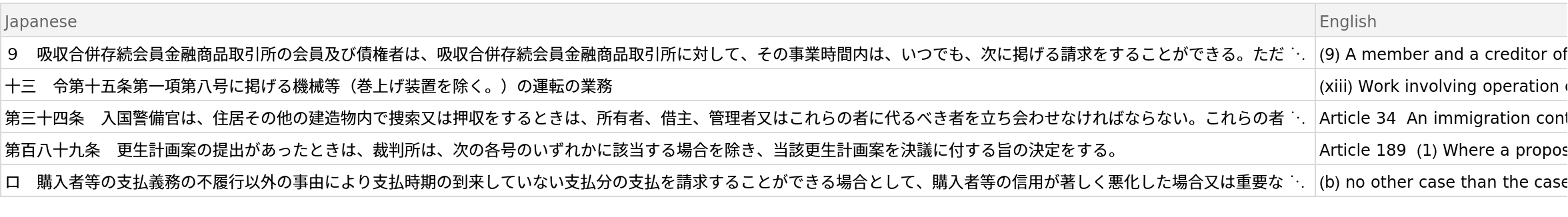 The Japanese-English Legal Parallel Corpus was created by crawling the Japanese Law Translation Database System. It contains parallel text of over 250,000 Japanese laws and over 4,000 legal terms.