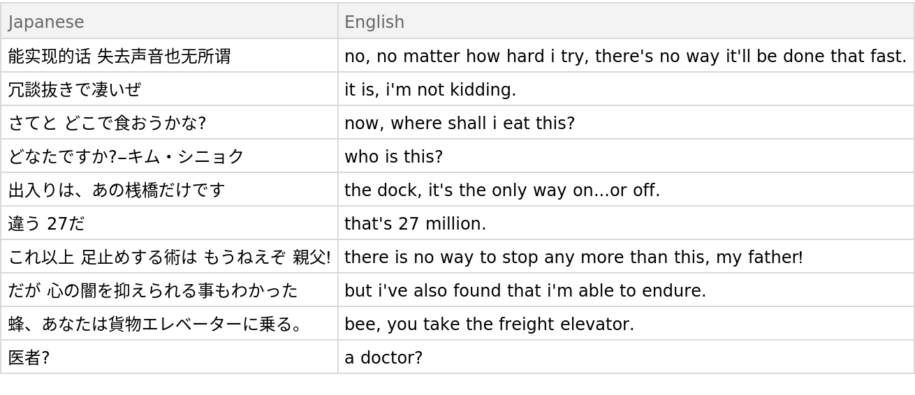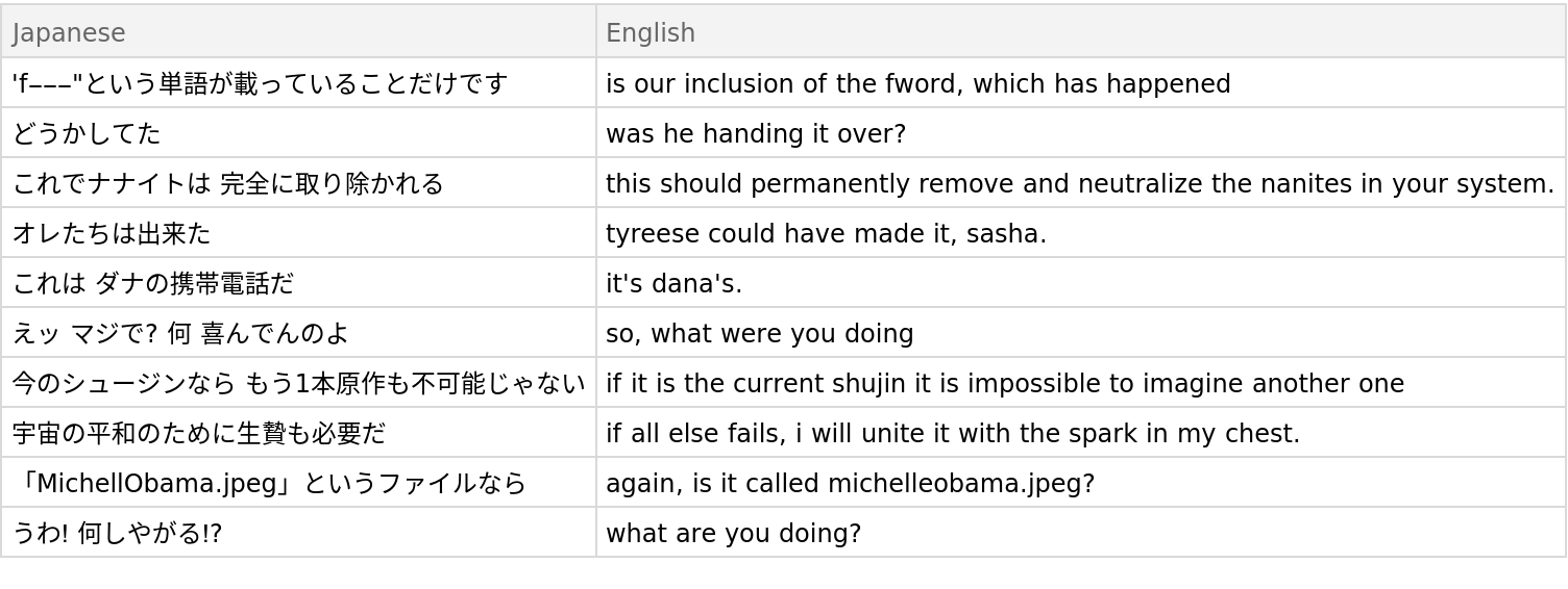 The Japanese-English Subtitle Corpus (JESC) is the product of a collaboration among Stanford University, Google Brain and Rakuten Institute of Technology. It was created by crawling the internet for movie and TV subtitles and aligning their captions. It is one of the largest freely available English-Japanese corpora (3.2M parallel sentences), and covers the poorly represented domain of colloquial language.