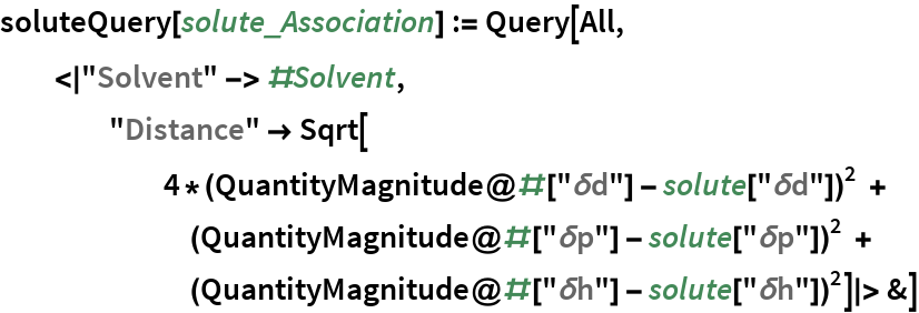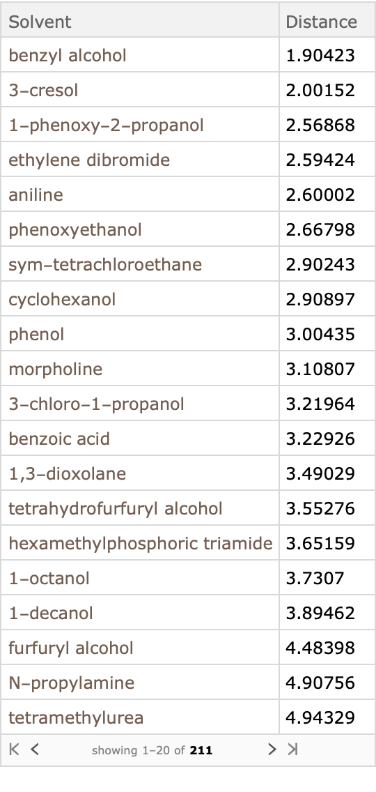 Apply this query to the dataset, sorting by Distance; the solvents with the smallest distance are predicted to be better solvents: