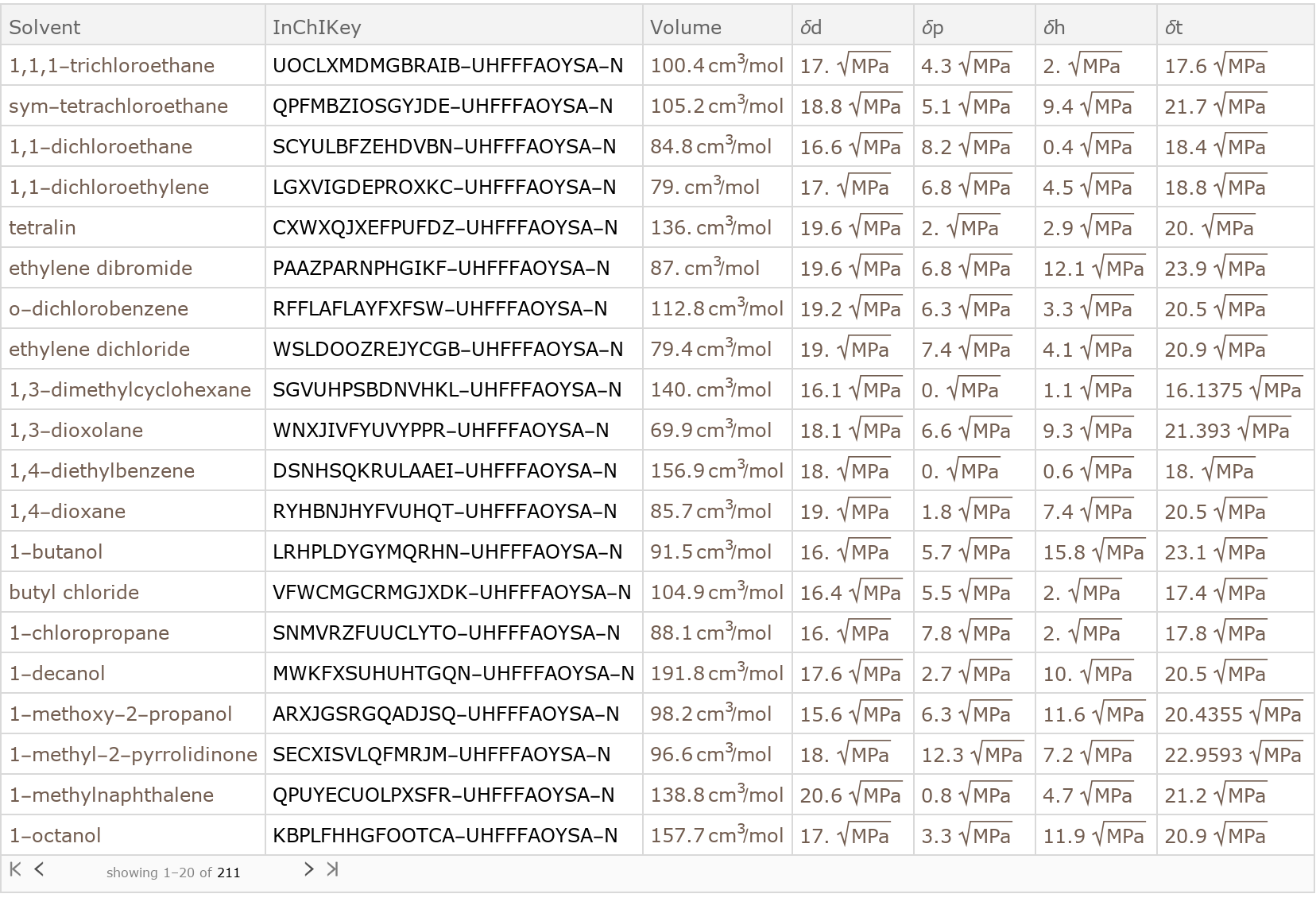 Because the Solvent entries are described by Chemical entities, the properties of those entities can be queries to provide access to other indexing schemes, such as the CAS Number of the molecule: