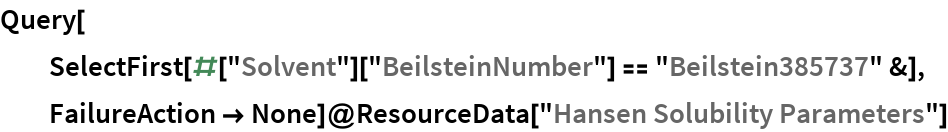 Similarly, Beilstein numbers are contained in the Chemical entity entries. Not all of the Wolfram Chemical Entities have Beilstein number data, so it is useful to define the FailureAction for the Query to ignore these: