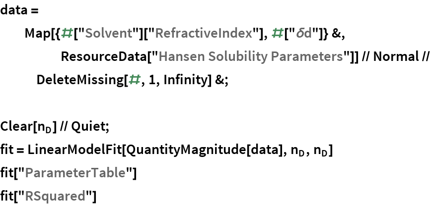 The interaction energy between nonpolar molecules should depend on the molar polarizability (London dispersion forces) and therefore the index of refraction; this is represented by the dispersive parameter, δd. Extract these values, deleting entries where the Chemical entity lacks the refractive index data: