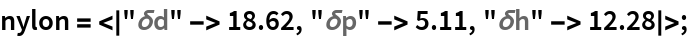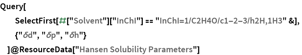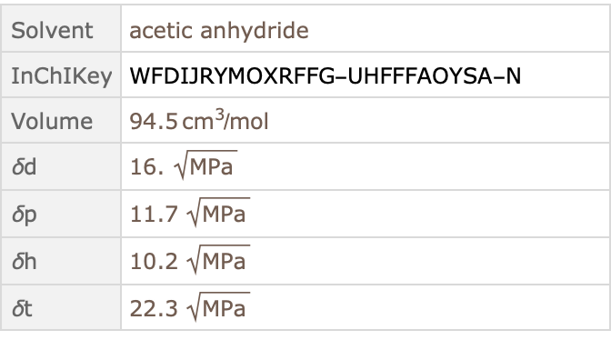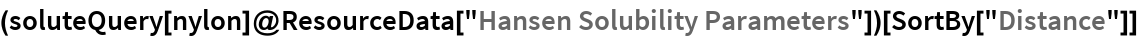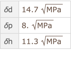 Hansen parameters quantify “like dissolves like” solvation rules by the distance between a solutes Hansen triple (usually empirically determined), and the solvent properties. There is a modified Euclidean distance between the solute and solvent triples (the dispersive feature, δd, has an additional factor of 4). For example, a particular formulation of Nylon-66 has the Hanson triple: