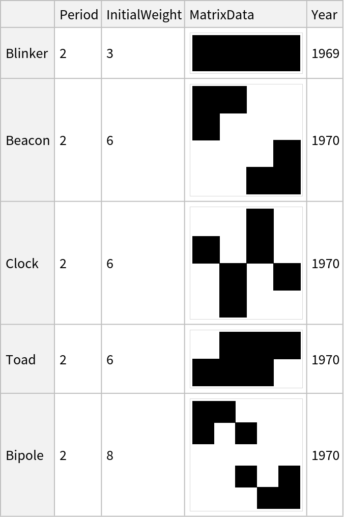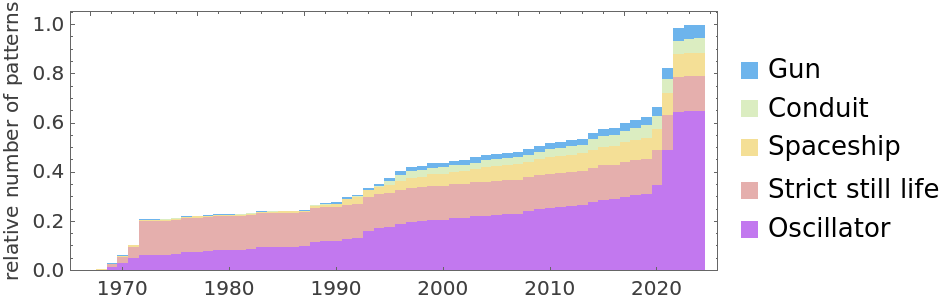 | "Class" | The type of pattern, potential classes include "Oscillator", "Strict still life", "Spaceship" and more |