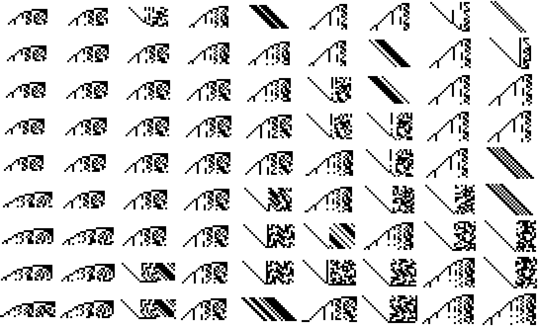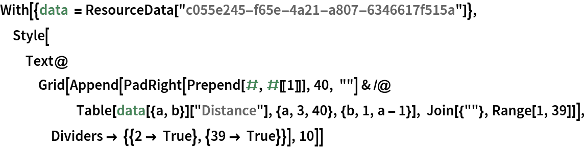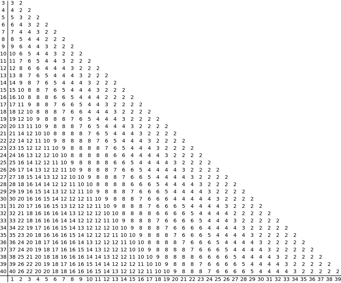 Generate a triangle of optimal distances with the blocklength (length of the codeword) on the left and the dimension (number of data bits) on the bottom: