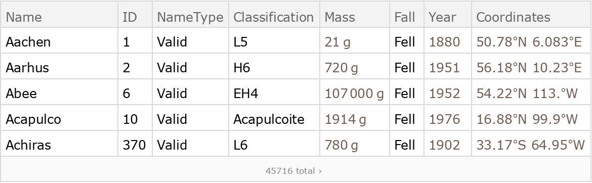 This dataset includes over 45,000 known meteorite landings in recorded history (up to 2013) as collected by The Meteoritical Society. For each landing, it includes the name and type of each object, the location of its discovery, whether it was discovered falling ('Fell') or already on the Earth ('Found'), and the condition of the meteorite as 'Valid' (for most meteorites) or 'Relict' (for objects that were once meteorites but are now highly altered by weathering on Earth).