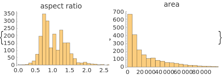 Plot histograms of painting aspect ratios and areas: