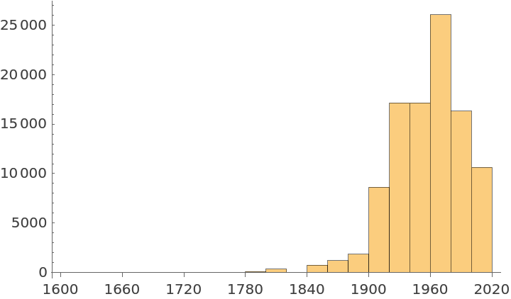 Make a date histogram of the completion dates of all works at MoMA: