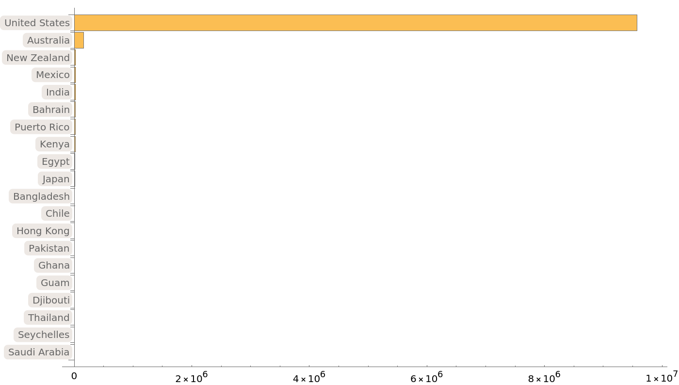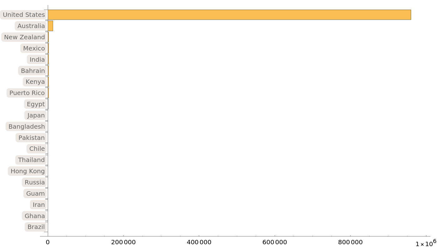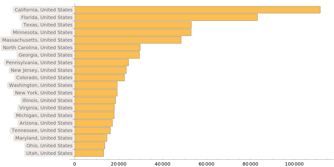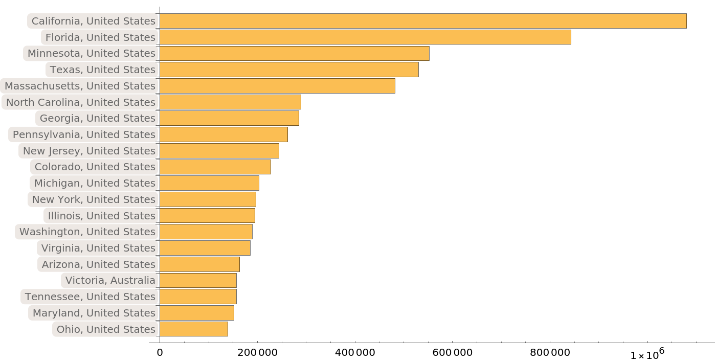 When we look at the geographic locations providing protein sequences with the most common title, “surface glycoprotein”, these proportions are largely maintained: