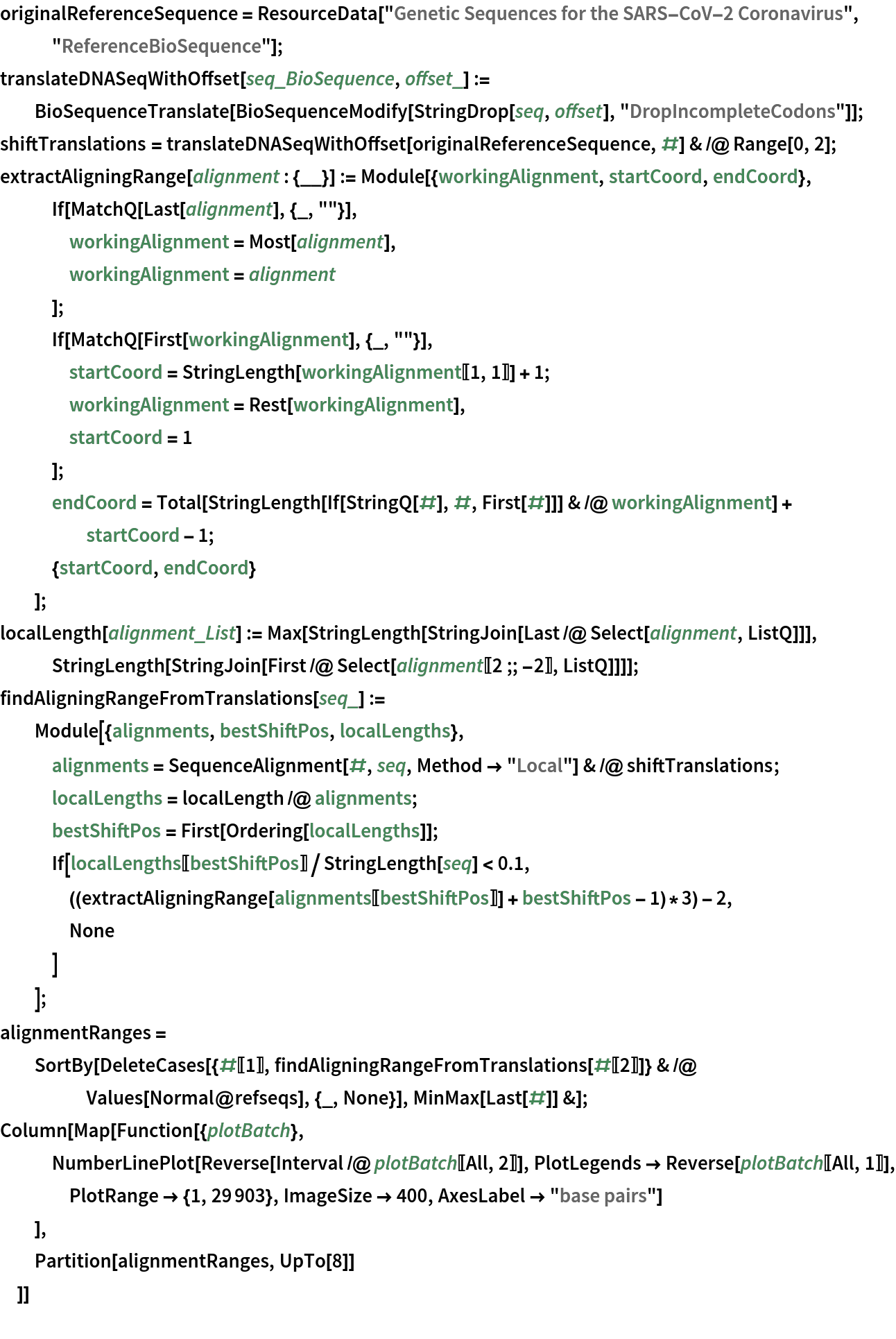 We can plot where these proteins are found along the reference SARS-CoV-2 genome. To properly find an alignment, we align the protein reference sequences with the translation of each potential frame shift and choose the best alignment:
