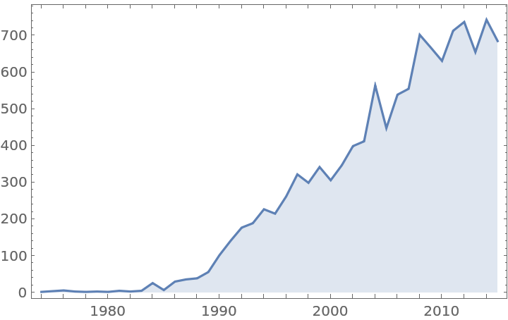 A time series of the number of papers published on cellular automata by year from 1974 through 2015