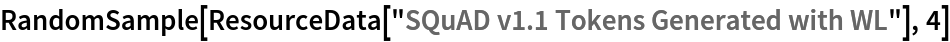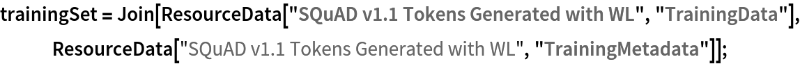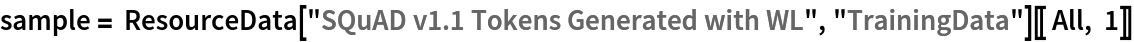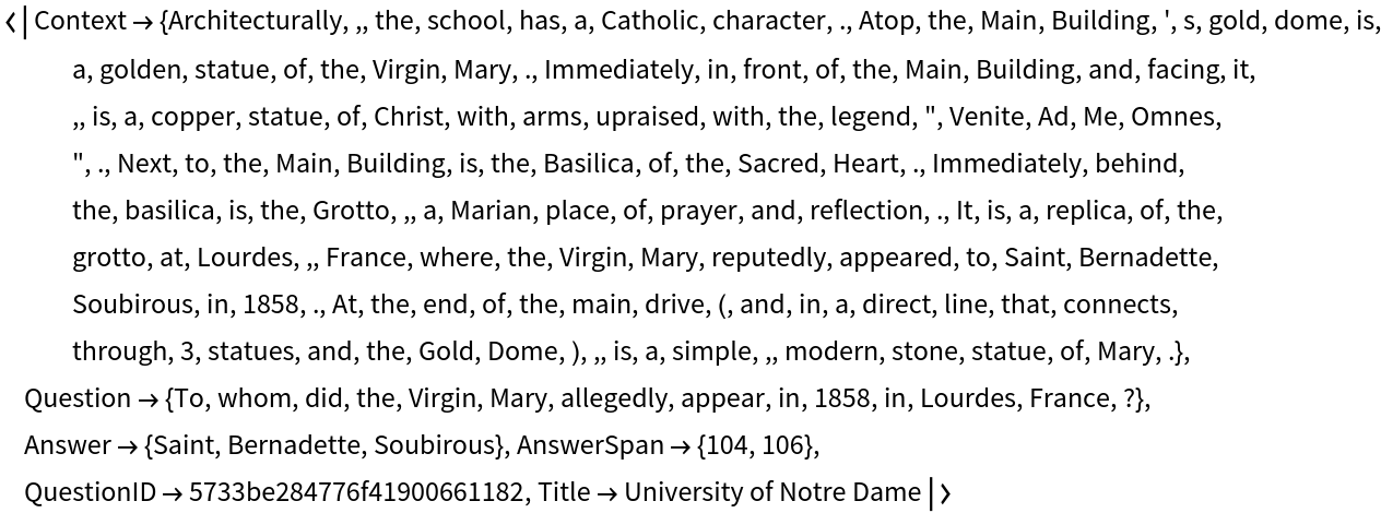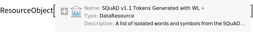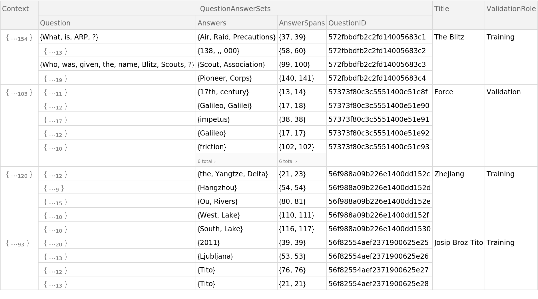 Modifications from the original dataset: Data marked "Training" in the ValidationRole field corresponds to the Training Set v1.1 subset of the original dataset. Data marked "Validation" in the ValidationRole field corresponds to the Dev Set v1.1 subset of the original dataset. The original dataset is 0-indexed, in order be accurate in the Wolfram Language, 1 was added to the value of "AnswerPosition", as the Wolfram Language is 1-indexed. This is a pre-processed form of the original dataset, where the pieces of text (Context, Questions and Answers) have been converted to a list of tokens with the following simple tokenization done in Wolfram Language: SimpleTokenize[text_String] := DeleteCases[StringTrim @ StringSplit[text, {WordBoundary, x:PunctuationCharacter :> x}], ""];. The answers are then labeled with the field AnswerSpans which corresponds to the first and the last indices of the tokens in Context. Most of the labeling errors of the original dataset could be detected and corrected during the process of computing these spans, given the character positions and the expected answer content.