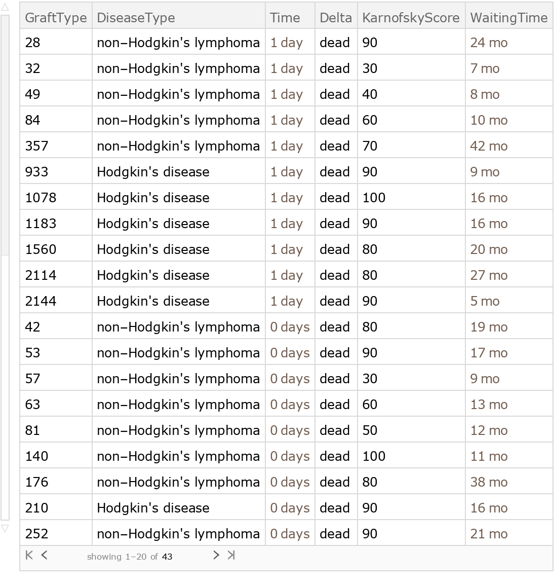 Wolfram Research, "Sample Data: Lymphoma Marrow Transplants" from the Wolfram Data Repository (2016) https://doi.org/10.24097/wolfram.18410.data