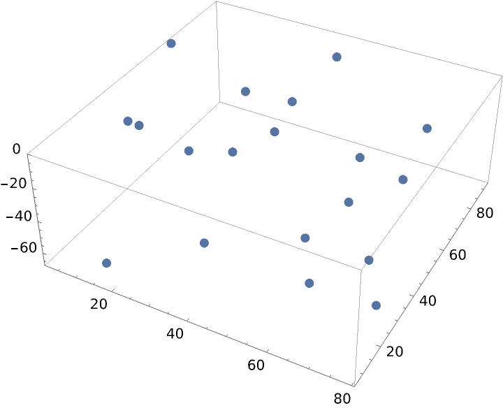 Locations of osteocyte (a star-shaped type of a mature bone cell) lacunae (pit) observed in a rectangular volume of solid bone in the observation region Cuboid[{0., 0., -75.}, {81., 100., 0.}] microns without annotations.