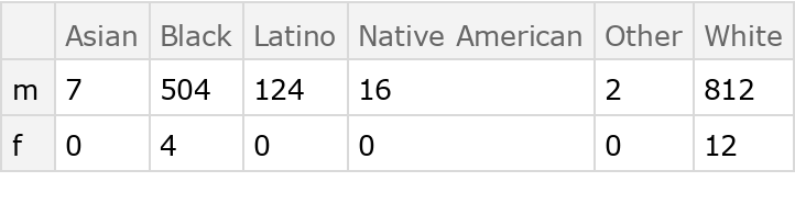 Query[GroupBy[#Sex &], (GroupBy[#Race &]) /* (Merge[{#, <|"White" -> 0, "Latino" -> 0, "Black" -> 0, "Native American" -> 0, "Asian" -> 0, "Other" -> 0|>}, First] &) /* KeySort, Length][