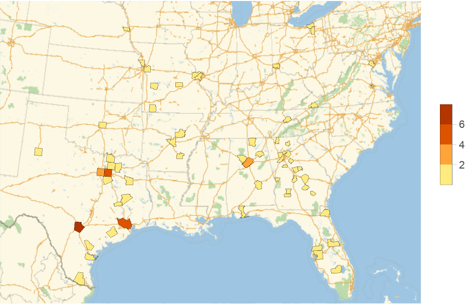 Query[Select[#Date > DateObject[{2015, 1, 1}] &] /* Counts /* GeoRegionValuePlot, "FullCounty"][