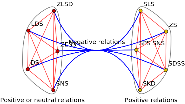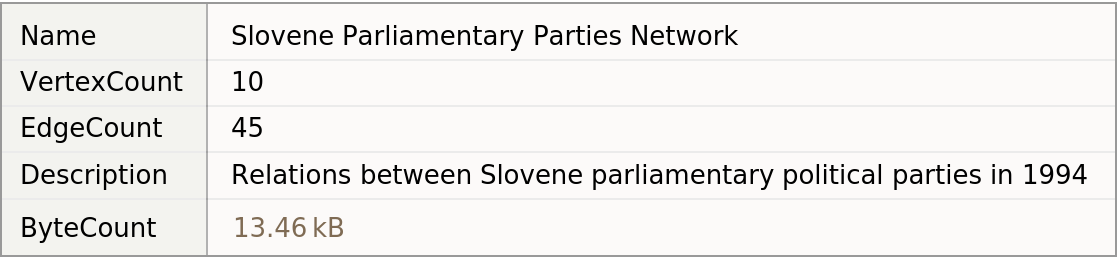 The Slovene parliamentary parties network shows relations between Slovene parliamentary political parties which were estimated by the members of the Slovene National Parliament. The vertex annotation "Description" gives a full description of party. The edge annotation EdgeWeight describes the political space distance between parties estimated by members.