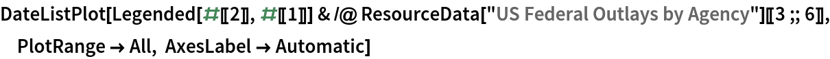 Legended[#[[2]], #[[1]]] & /@ ResourceData["US Federal Outlays by Agency"][[3 ;; 6]], PlotRange -> All, AxesLabel -> Automatic]