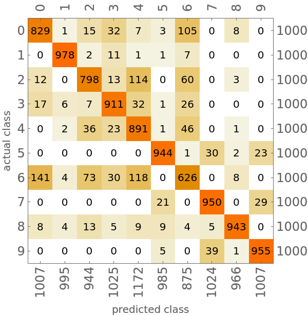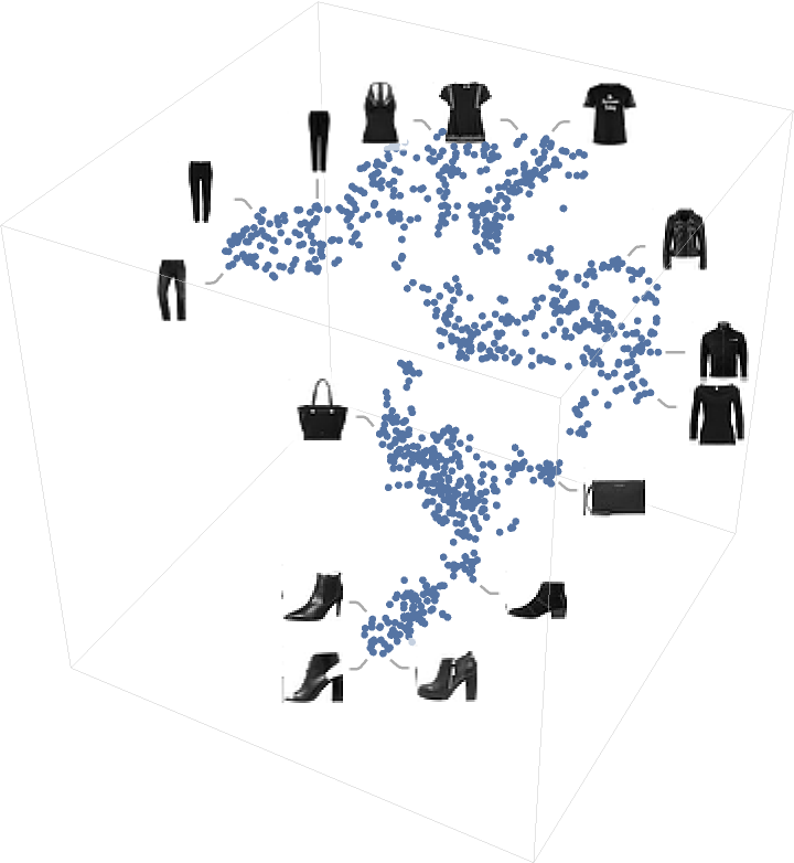 The classes of FashionMNIST are harder separate than the original MNIST. This can be seen in the uniform manifold approximation and projection (UMAP) plots of FashionMNIST (left) and the original digits MNIST (right)